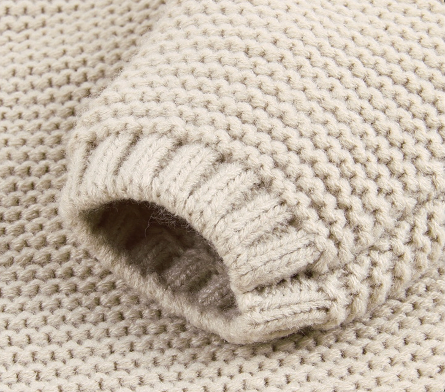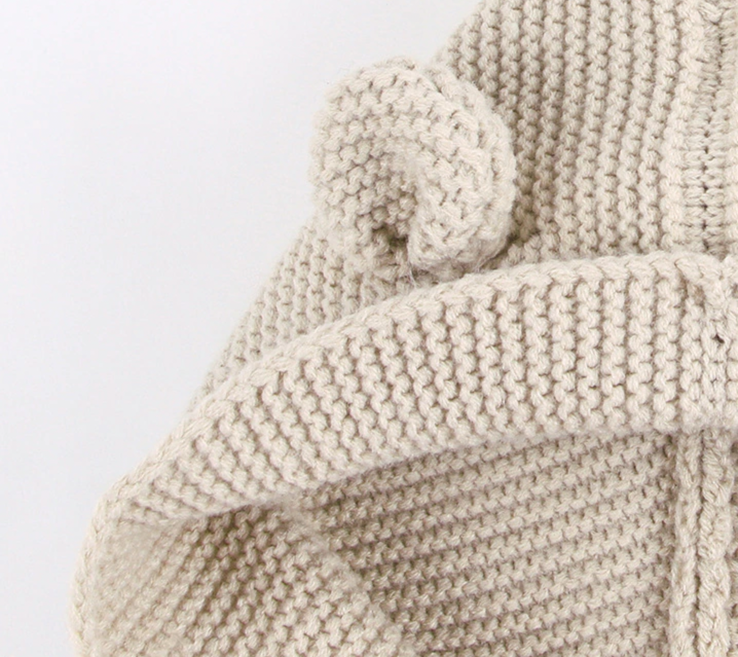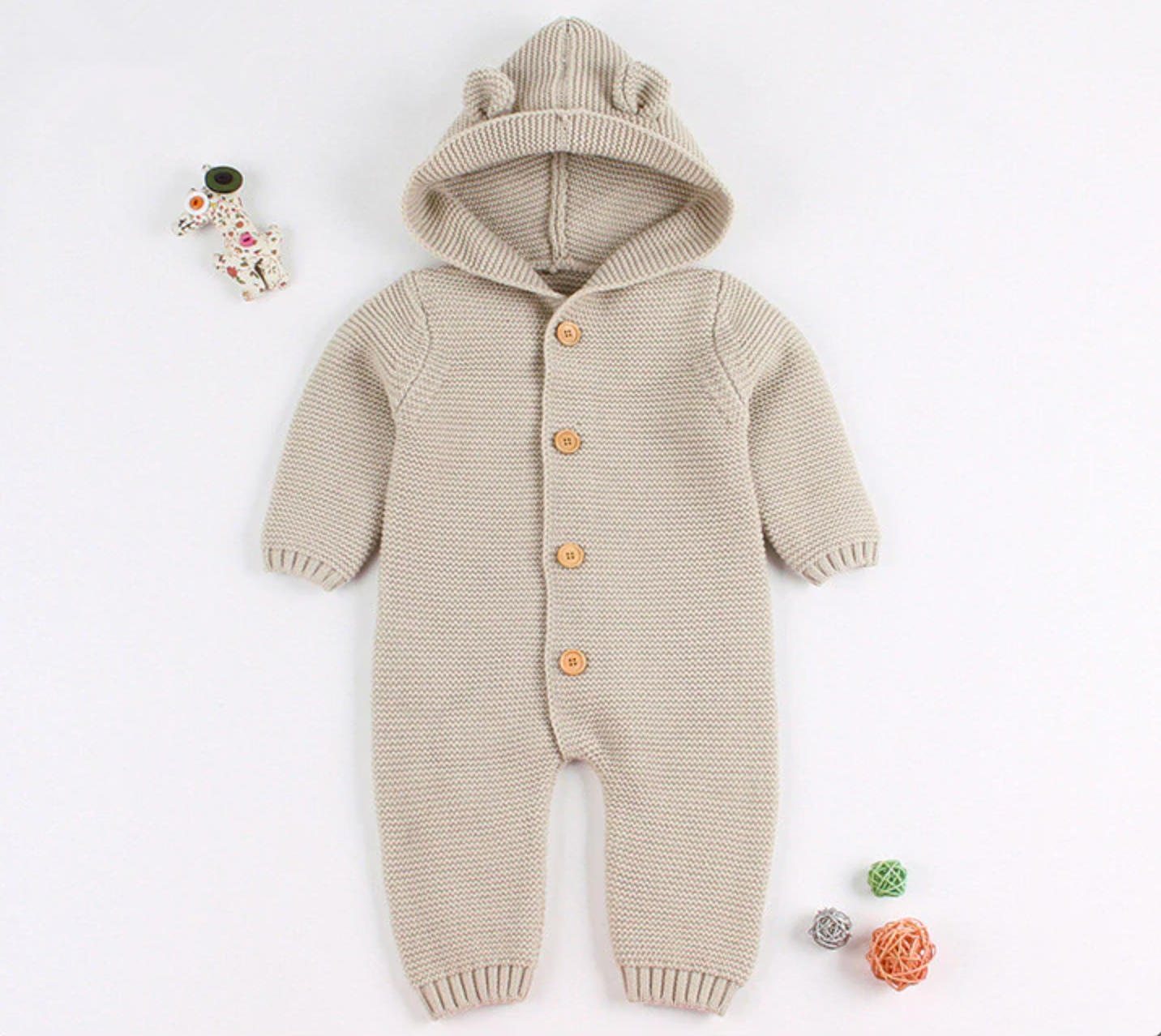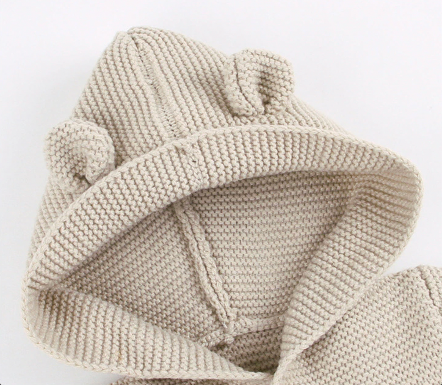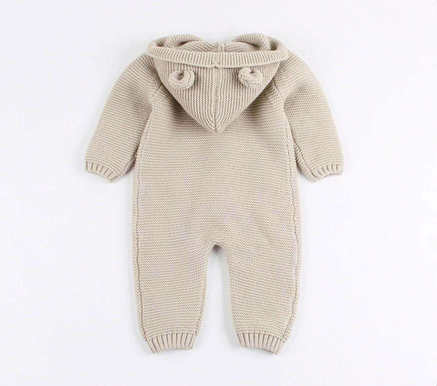 Knitted hooded jumpsuit in beige with bear ears on the hood.